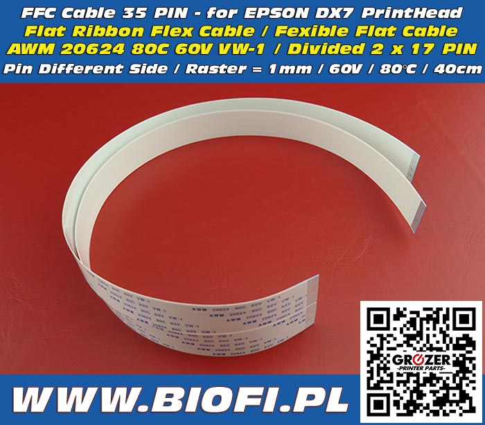 We present:Prezentujemy: FFC Cable 35 PIN 40 CMFlat Ribbon Flex Cable / Fexible Flat Cable AWM 20624 805C 60V VW-1Taśma Sygnałowa FFC do głowicy drukującej EPSON DX7 Typ Przewodu: Taśma FFC Napięcie znamionowe: 60V Temperatura pracy: -40...+80°C Raster Taśmy: 1mm Liczba żył: 35 Długość Taśmy: 40cm Szerokość Taśmy: 36mm Właściwości kabla połączeniowego: Styki po tej przeciwnych stronach Taśma dzielona po różnych stronach - 2 x 17 PIN Cable Type:: FFC Cable Rated voltage: 60V Working temperature: -40...+80°C Raster: 1mm Number of pins: 35 Cable Length: 40cm Cable Width: 36mm Connectin Side: Pins on the Different Side (PDS) Tape divided on differnet side - 2 x 17 PIN Do Głowicy drukującej: EPSON DX7 oraz do drukarek innych producentów: ALPHA | ADDTOP | Allwin | Ameritor | Aome | Aprint | A-Starjet | AUDLEY | AYON | AZON | CAE | Colorworld | Dazzle Jet | DEM-JET | DERUGE | Disen | DO-IT | DOS | DS.MLG | Fortune-Lit | FULUKE | GALAXY | GARROS | Gateway | Glitter | Gohoo | Gongzheng | Hanze Electrical | HC | Helitin | Human | INFINITI | Inkworld | Inkworld-Xenons | KMBYC | LECAI | Leicai | Locor | LOGE | L-TEC | MINGYANG | Micolor | MT | MT-Starjet | NICE | Niprint | NUOCAI | Orient LongKe | Perfect Laser | Qingdao | CSY | Reach | SAER | Saishun | SaiTu | SCIJET | Seron | Signstar | SinoColor | Sky-Color | SKYJET | SMART | Smart Color | Stormjet | SUKE | TITAN-JET | TJET | Toyo | UD-Galaxy | Ultra Smart | WER | Win-Color | WinJET | Wit-Color | Xenons | X-Roland | Xuli | YH | YIFANG | Yilong | Yinghe | YORKDEAL | Yueda | Zenith | ZY | ZZG
