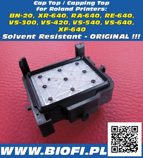 Roland Cap Top - (Capping) - powinien być wymieniony kiedy czyszczenie głowicy i test druku są niezadowalające. Najczęstszym tego powodem jest: uszkodzona guma na cap-topie, pofalowana guma na cap-topie, zatkany cap-top przez zaschnięty tusz.