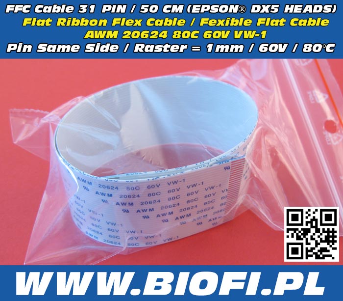 We present: Prezentujemy: FFC Cable 31 PIN 50 CM Flat Ribbon Flex Cable / Fexible Flat Cable AWM 20624 80C 60V VW-1 Taśma Sygnałowa FFC (np. do EPSON® DX5 PrintHead) Typ Przewodu: Taśma FFC Napięcie znamionowe: 60V Temperatura pracy: -40...+80°C Raster Taśmy: 1mm Liczba żył: 31 Długość Taśmy: 50cm Szerokość Taśmy: 32mm Właściwości kabla połączeniowego: Styki po tej samej stronie Cable Type:: FFC Cable Rated voltage: 60V Working temperature: -40...+80°C Raster: 1mm Number of pins: 31 Cable Length: 50cm Cable Width: 32mm Connectin Side: Pins on the Same Side (PSS) Do Drukarek / For Printers: GROZER EPSON | MUTOH | Mimaki | Inne