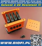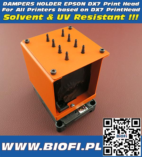 Uchwyt eliminuje nieszczelne połączenie pomiędzy głowicą a damperami. Dzięki niemu dampery są trwale umocowane w adapterze głowicy co daje pełną stabilizację dopływu tuszu w trakcie pracy karetki drukarki. Dodatkowo trwałe połączenie w uchwycie uniemożliwia wyłamywanie trzpieni adaptera głowicy. This Holder eliminates the leaky connection between the head and the damper. Thanks to it, the dampers are permanently fixed in the head adapter which gives full stabilization of the ink supply during the operation of the printer carriage. In addition, a permanent connection in the holder prevents the heads of the head adapter from being broken. W skład zestawu wchodzą: Uchwyt wraz ze śrubami 4 x Damper The set includes: Holder with screws 4 x Damper Do Drukarek: ALPHA | ADDTOP | Allwin | Ameritor | Aome | Aprint | A-Starjet | AUDLEY | AYON | AZON | CAE | Colorworld | Dazzle Jet | DEM-JET | DERUGE | Disen | DO-IT | DOS | DS.MLG | Fortune-Lit | FULUKE | GALAXY | GARROS | Gateway | Glitter | Gohoo | Gongzheng | Hanze Electrical | HC | Helitin | Human | INFINITI | Inkworld | Inkworld-Xenons | KMBYC | LECAI | Leicai | Locor | LOGE | L-TEC | MINGYANG | Micolor | MT | MT-Starjet | NICE | Niprint | NUOCAI | Orient LongKe | Perfect Laser | Qingdao | CSY | Reach | SAER | Saishun | SaiTu | SCIJET | Seron | Signstar | SinoColor | Sky-Color | SKYJET | SMART | Smart Color | Stormjet | SUKE | TITAN-JET | TJET | Toyo | UD-Galaxy | Ultra Smart | WER | Win-Color | WinJET | Wit-Color | Xenons | X-Roland | Xuli | YH | YIFANG | Yilong | Yinghe | YORKDEAL | Yueda | Zenith | ZY | ZZG TO AVOID CLOGGED HEAD We recommend replacing the dampers every 6 months or in the worst case every 12 months! ABY UNIKNĄĆ ZATKANIA GŁOWICY Zalecamy wymianę damperów co 6 miesięcy, a w najgorszym razie co 12 miesięcy !!!