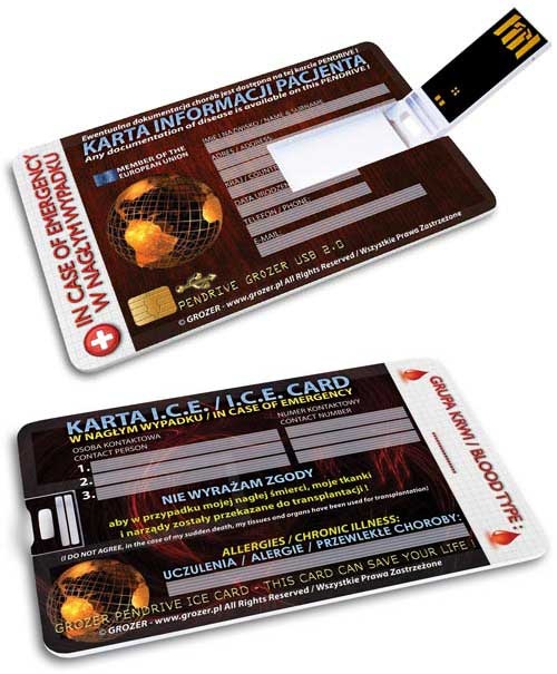 Karta Pendrive z Twoimi danymi kontaktowymi, telefonami do najbliższych, grupą krwi, brakiem zgody na transplantację organów, listą alergii i przewlekłych chorób, plus opcjonalnie wgraną historią chorób na kartę Pendrive GROZER. Dane osobowe uzupełnisz markerem permanentnym.